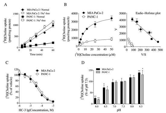 Functional characterization of choline uptake in MIA PaCa-2 and PANC-1 cells revealed a single, sodium-independent uptake mechanism. Choline uptake was completely inhibited by HC-3, a choline-uptake inhibitor with an IC