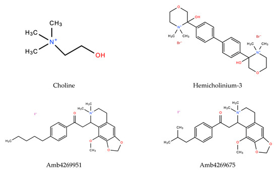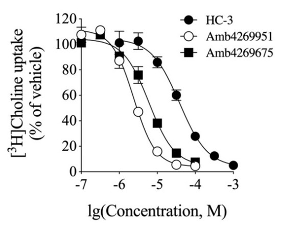 9]. Since choline has the trimethyl moiety of the cation, and HC-3, Amb4269951, and Amb4269675 have the dimethyl moiety of the cation, it is possible that these cationic sites serve as the recognition sites for CTL1. It is necessary to examine the structure–activity relationship of the cation site with structural modifications to reveal the recognition site of CTL1.