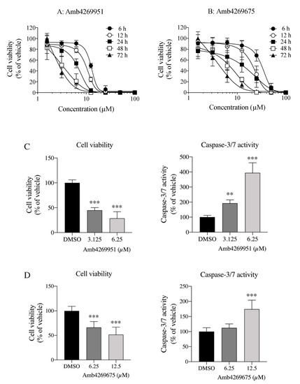20]. MIA PaCa-2 cells were cultured in 96-well plates with 1000 cells/well. Amb4269951, Amb4269675, and ceramide were added 24 h after cell culture. The final concentration of DMSO used as solvent was set at 1%. Caspase-3/7 activity and cell numbers were simultaneously measured using Caspase-Glo