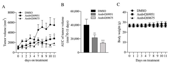 The in vivo antitumor effects of Amb4269951 and Amb4269675 were compared using a mouse-xenograft model. Both Amb4269951 and Amb4269675 inhibited tumor growth, and no weight loss was observed. Classic antitumor drugs such as cisplatin were reported to cause severe weight loss [