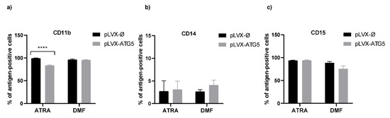 Increased expression of ATG5 affects the all-trans retinoic acid (ATRA)-induced differentiation of HL-60 cells. HL-60-ATG5 and mock control cells were differentiated into granulocyte-like cells by treatment with 1 µM ATRA or 70 mM dimethylformamide for 5 days. (a–c) Cells were harvested, stained with appropriate antibodies and differentiation was assessed by evaluating surface expression level of CD11b, CD14 and CD15 by flow cytometry. The data are presented as the means + SEM, n = 5 where n is the number of replicate experiments. **** p ≤ 0.0001 versus mock control, Kruskal–Wallis test with post-hoc Dunn’s test.