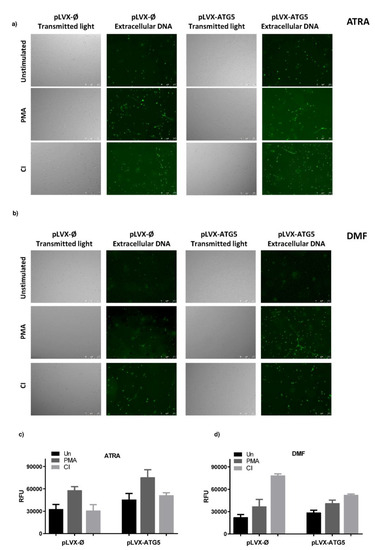 To characterize neutrophils functions in dHL-60 cells overexpressing ATG5, we first determined their ability to release NETs. ATRA- and DMF-differentiated mock control and HL-60-ATG5 cells were stimulated for 3 h with phorbol 12-myristate 13-acetate (PMA) and calcium ionophore A23187 (CI). The measurement of extracellular DNA by fluorometry revealed that in ATRA-dHL-60 cells, PMA is a stronger NETs inducer than CI, however there was no statistically significant difference in the ability to form NETs between examined cell lines. In DMF-dHL-60 cells, the highest amount of DNA was released after CI stimulation and, similarly to ATRA-dHL-60, tested cell lines released comparable amounts of DNA (Figure 3c,d). In addition, the qualitative analysis of NETs release was carried out using fluorescent microscopy. This analysis of in vitro NETs release confirmed observations based on the quantitative method (Figure 3a,b).