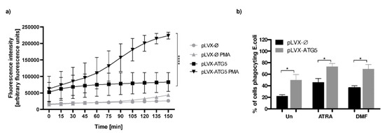 Furthermore, we investigated whether overexpression of the ATG5 gene in dHL-60 cells may affect phagocytosis, another antimicrobial function, besides NET formation and oxidative burst. Interestingly, we observed that undifferentiated HL-60 cells with increased expression of the ATG5 gene reveal statistically significantly higher ability to phagocyte E. coli particles when compared to mock control. In addition, similar observations were made for ATRA-differentiated and DMF-differentiated HL-60 cells (Figure 4b).