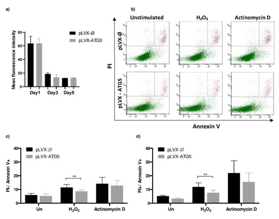 It was highlighted that ATG5 protein is also engaged in the regulation of apoptosis [9] and may protect from H2O2-induced apoptosis [14]. Therefore, we incubated HL-60 cells with two distinct commonly used apoptosis inducers (actinomycin or H2O2). Subsequently, phosphatidylserine (PS) plasma membrane externalization, one of early stages of apoptosis, was evaluated by annexin V/propidium iodide (PI) and analyzed by flow cytometry. Interestingly, the percentage of early and late apoptotic cells was lower in cells overexpressing ATG5 than in mock control in both actinomycin D-treated and H2O2-treated groups, whereas statistical significance was observed only for H2O2 (Figure 5b,c). Our results suggest that ATG5 may play a protective role against cell death in HL-60 cell line.