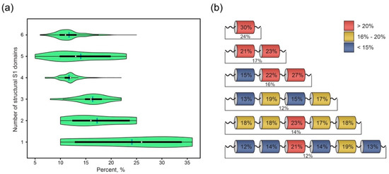 We revealed that the percentages of amyloidogenic regions in the separate domains are closer in similarity (taking into account the deviations) than those for the full-sized proteins (Table 2). Thus, the highest percentage was found for one-domain containing proteins according to all the programs (30%—FoldAmyloid and Waltz, 46%—PASTA2.0 and 61%—Aggrescan). This fact is due to the presence of the ribosomal S1 protein sequence from Mycoplasma mobile (UniProt ID: Q6KH89) in this group, which has the highest percentage of the amyloidogenic regions among all the studied proteins (1331 records), more than 50% according to the used programs. The lowest percentages corresponded to the three-domain proteins (13%) when using the PASTA2.0 program (14% for the first domain in the three-domain proteins) and the Aggrescan program (24% for the second domain in the three-domain proteins). For these domains, the FoldAmyloid and Waltz programs also predicted about 15–20%. Moreover, the first S1 domain in six-domain proteins was identified as the domain having the smallest percentage of amyloidogenic regions (11–12%) according to the FoldAmyloid and Waltz programs. In general, it can be seen that the predictions of programs for different domains vary greatly and are difficult to interpret. Therefore, it is more appropriate to study the actual distribution of amylodoigenic regions in each structural domain.