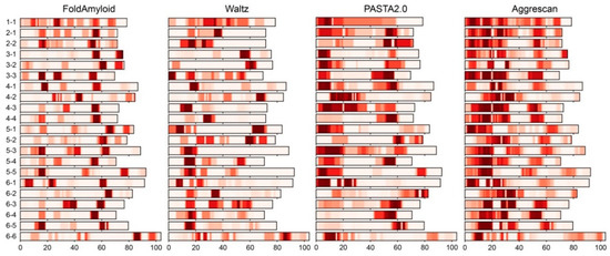 Distribution of amyloidogenic regions in the separate Table S1 domains according to the FoldAmyloid, Waltz, PASTA 2.0 and Aggrescan programs. The color scale corresponds to the frequency distribution of the amyloidogenic regions along the protein chain (aligned protein sequences). The size of each structural domain is about 70 amino acid residues (a.a.).