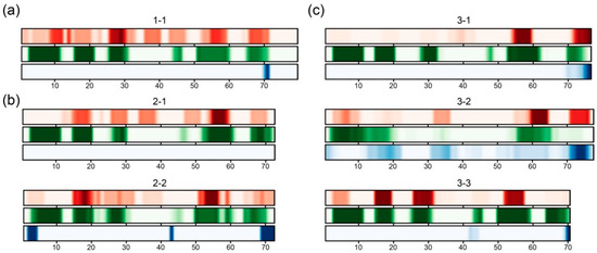 Distribution of amyloidogenic regions (orange) and secondary structures (green for β-strands; blue for α-helix) in the separate S1 domains according to FoldAmyloid for (a) one-domain S1 proteins, (b) two-domain S1 proteins (2-1 and 2-2) and (c) three-domain S1 proteins (3-1, 3-2 and 3-3). The color scale corresponds to the frequency distribution of residues along the protein chain (aligned protein sequences). The size of each structural domain is about 70 a.a. For the prediction of the secondary structure for each sequence in our dataset, the Jpred4 program [26] was used.