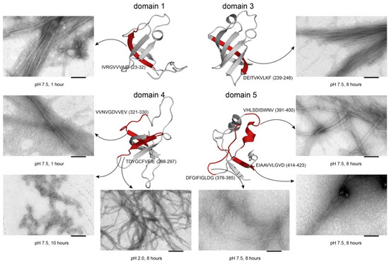 3D structures of the S1 domains from T. thermophilus. Experimentally studied amyloidogenic regions (position and sequence are given) are highlighted with red color. 3D structures of domains 3 and 5 were predicted using the Robetta server. Scale bar = 100 nm.