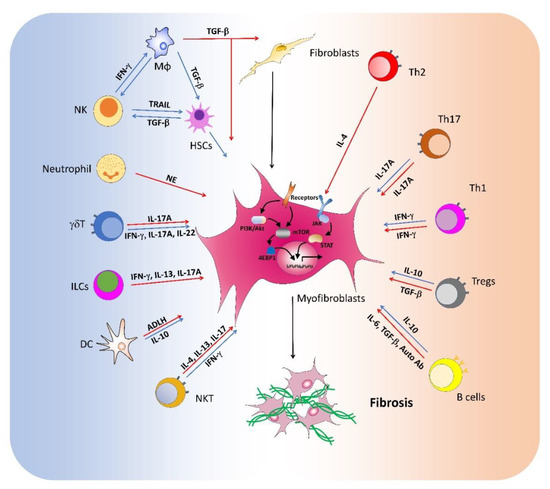 Immune cell targeted therapies for fibrotic diseases have been developing rapidly during recent years. Preclinical studies in fibrotic animal models have provided important information on novel immune-based therapeutic strategies by targeting different immune cells. Moreover, the molecular insights into fibrogenesis have suggested clinical therapeutic potential by targeting key molecular components, including PI3K/mTOR and JAK-STAT pathways [183,184,185,186]. Future controlled clinical trials are essential to evaluate the safety and efficacy of potential therapies in patients with fibrotic diseases.