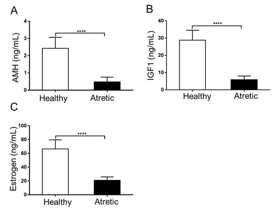 Insulin-like growth factor 1 (IGF1, follicle fluid diluted 1:3; Porcine IGF1 ELISA Kit; CUSABIO, Wuhan, China), anti-Müllerian hormone (AMH, follicle fluid diluted 1:4; Porcine AMH ELISA Kit; CUSABIO), and estradiol levels (follicle fluid diluted 1:2; Porcine estradiol ELISA Kit, Enzo Life Sciences, Shenzhen, China) were determined, according to the protocol of the respective suppliers as reported previously [45]. The inter-assay variation was less than 10% for all assays.