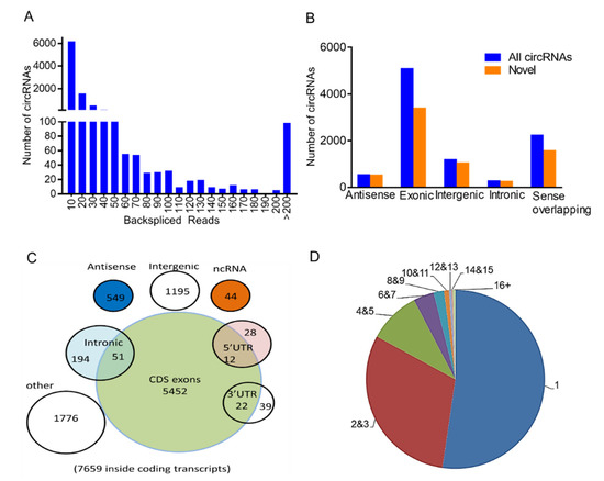 In total, 9362 distinct circRNAs containing at least two unique back-spliced reads (Figure 2A) were identified based on the circRNAs identification standard [23]. Although 67.3% of circRNAs had average coverage of less than 10 unique back-spliced reads, there were 441 circRNAs highly expressed containing a high-average read count of more than 50, including circ_KIF16B, circ_IL1R1, circ_SLC30A7, and circ_ANGPT1. We identified 2515 overlapping circRNAs and 6847 novel circRNAs that had not been identified so far (Figure 2B; [24,25]). The 54.36% (5090/9362) of circRNAs identified were derived from exons and generated from individual linear cognate genes. The remainder were annotated to sense, among others, overlapping (2243/9362) and intergenic regions (1195/9362). All exonic circRNAs were spliced from protein-coding exons (Figure 2C). The length of most exonic circRNAs was less than 1300 nucleotides (nt), with a median length of ~900 nt (Figure S2A). CircRNAs were widely distributed across all chromosomes, with chromosome 1 containing the highest number of circular transcripts, namely, >1000 circRNAs, including 709 novel transcripts (Figure S2B).