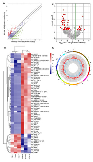 Profiles of differentially expressed circRNAs (DE-circRNAs). (A) Scatter plot, assessing the overall distribution of DE-circRNAs between HA and AA follicles. Values on the horizontal and vertical axis represent the averaged normalized signal values of each group (log2 transformed). The red and green dots indicate circRNAs with fold change (FC) ≥ 2.0. (B) Volcano plot, visualizing the statistical difference of the DE-circRNAs. The horizontal axis represents the FC of detected circRNAs, and the vertical axis represents the p-value. The red dots in the plot denote the significantly different DE-circRNAs (FC ≥ 2.0 and p ≤ 0.05, respectively). (C) Hierarchical clustering, showing the expression profiles of all the DE-circRNAs. Rows represent circRNAs, while columns represent different samples. The circRNAs were classified according to Pearson correlation. (D) Circos plot, showing the distribution of DE-circRNAs on porcine chromosomes. From the outside to the inside, the circos plot was divided into three layers. The first layer indicated the chromosome map of the porcine genome, where the DE-circRNAs were located. The second layer with red bars denoted the mean expression levels of DE-circRNAs in AA follicles, while the third layer represented the average expression levels of DE-circRNAs in HA follicles. CDS, protein-coding exons. Follicles were isolated in batches at three different time points, each batch containing 15–20 ovaries.