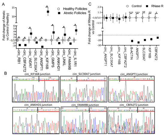 In ovarian antral follicles, granulosa cells are subdivided into two distinct classes that are anatomically and functionally distinct: mural granulosa cells, which line the follicular wall, and cumulus granulosa cells, which surround and are in direct contact with the oocyte, together forming the cumulus-oocyte-complex (COC) [36]. There are several observations that have demonstrated that in antral follicular atresia, mural granulosa cells undergo apoptosis, while, at the same time, the cumulus cells remain healthy [37,38]. We confirmed these observations as we did not see morphological differences between COCs retrieved from AA or HA follicles. The absence of a difference in transcript content of circ_CBFA2T2 and circ_KIF16B between cumulus granulosa cells from HA and AA follicles further supported the morphological observation that during follicular atresia when increasing numbers of mural granulosa cells underwent apoptosis, cumulus cells remained healthy. It is not until late-stage atresia when most mural cells have undergone apoptosis that the cumulus cells also become apoptotic [36].