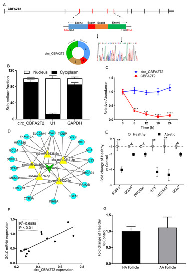 The characterization and putative role of circ_CBFA2T2. (A) The genomic loci of circ_CBFA2T2 in the CBFA2T2 gene. The expression of circ_CBFA2T2 was validated by qRT-PCR, followed by Sanger sequencing. Arrows represent divergent primers binding to the genome region of circ_CBFA2T2. (B) Cellular characterization of circ_CBFA2T2. Levels of nuclear control transcript (U1), cytoplasmic control transcript (GAPDH and mRNA), and circ_CBFA2T2 were assessed by qRT-PCR in nuclear (n = 3) and cytoplasmic (n = 3) fractions of porcine granulosa cells. Data are presented as a percentage of U1, GAPDH, and circ_CBFA2T2 levels. (C) qRT-PCR for the abundance of circ_CBFA2T2 (blue line, n = 3) and CBFA2T2 mRNA (red line, n = 3) in granulosa cells treated with actinomycin D at the indicated time points. (D) A putative ceRNA network of circ_CBFA2T2 constructed by Cytoscape 3.8. The green V shape represents circ_CBFA2T2, the yellow triangle represents targeted miRNAs, and blue circles denote targeted mRNAs. (E) qRT-PCR for the abundance of mRNA content of eight targeted genes in granulosa cells of HA (open circles, n = 6) and AA (filled squares, n = 6) follicles. (F) Association of expression levels of circ_CBFA2T2 and GCLC. (G) circ_CBFA2T2 expression in cumulus cells of HA (black bar, n = 6) and AA (grey bar, n = 6) follicles, as measured by qRT-PCR. Gene expression, as fold change of AA over HA follicles, with no change, was indicated as 1. *, p < 0.05; **, p < 0.01. Follicles were isolated in batches at three different time points, each batch containing 15–20 ovaries.
