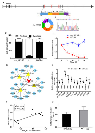 Characterization and putative role of circ_KIF16B. (A) The genomic loci of circ_KIF16B in the KIF16B gene. The expression of circ_KIF16B was validated by qRT-PCR, followed by Sanger sequencing. Arrows represent divergent primers binding to the genome region of circ_KIF16B. (B) Cellular characterization of circ_KIF16B. Levels of nuclear control transcript (U1), cytoplasmic control transcript (GAPDH and mRNA), and circ_KIF16B were assessed by qRT-PCR in nuclear (n = 3) and cytoplasmic fractions (n = 3) of porcine granulosa cells. Data are presented as a percentage of U1, GAPDH, and circ_KIF16B levels. (C) qRT-PCR for the abundance of circ_KIF16B (blue line, n = 3) and KIF16B mRNA (red line, n = 3) in granulosa cells treated with actinomycin D at the indicated time points. (D) A putative ceRNA network of circ_KIF16B constructed by Cytoscape 3.8. The red V shape represents circ_KIF16B, the yellow triangle represents targeted miRNAs, and blue round circles denote targeted mRNAs. (E) qRT-PCR for the abundance of mRNA content of 10 targeted pro-apoptotic genes in granulosa cells of HA (open circles, n = 6) and AA (filled squares, n = 6) follicles. (F) Correlation of expression levels of circ_KIF16B and TP53. (G) circ_KIF16B expression in cumulus cells of HA (black bar, n = 6) and AA follicles (grey bar, n = 6), as measured by qRT-PCR. Gene expression, as fold change of AA over HA follicles, with no change, was indicated as 1. KIF16B, kinesin family member 16B; *, p < 0.05; **, p < 0.01. Follicles were isolated in batches at three different time points, each batch containing 15–20 ovaries.