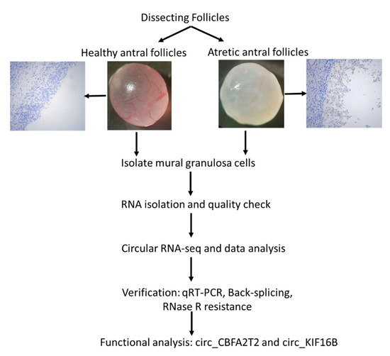 In the present study, we intended to address the question of whether there is a role for circRNAs in the process of granulosa cell apoptosis. Due to the easy accessibility to large quantities of porcine ovarian tissue, we chose to use the pig as an animal model to investigate the role of circRNAs in antral follicular atresia. For this purpose, the features of circRNAs in porcine granulosa cells derived from healthy and atretic antral follicles were studied using RNA-seq, followed by qRT-PCR in combination with circRNA-miRNA-mRNA network construction and validation.