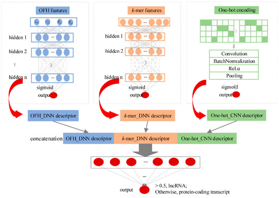 LncRNA_Mdeep mainly consisted of the following phases: (1) Extracted the OFH feature and k-mer feature from transcript sequences and used one-hot encoding strategy to encode the transcript sequences; (2) Built two DNN models and a CNN model to mine the high-level representations from OFH feature, k-mer feature, and one-hot encoding of transcript sequences, respectively; (3) Fused the learned representations (namely, OFH_DNN descriptor, k-mer_DNN descriptor, and One-hot_CNN descriptor) to represent the transcript sequences; (4) Fed three descriptors into a DNN to distinguish lncRNAs from protein-coding transcripts. The overview of lncRNA_Mdeep is illustrated in Figure 1.