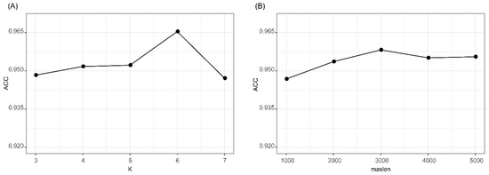Results of k-mer_DNN and One-hot_CNN with different parameters. (A) Accuracy of k-mer_DNN with different k values. (B) Accuracy of One-hot_CNN with different maxlen values. k-mer_DNN, the DNN model with the k-mer feature as input. One-hot_CNN, the CNN model with one-hot encoding as input.