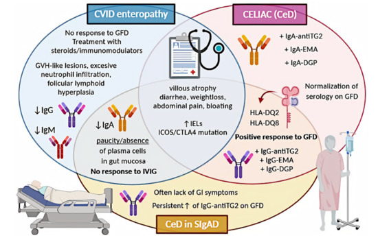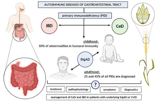 - Falchuk, K.R.; Falchuk, Z.M. Selective immunoglobulin a deficiency, ulcerative colitis, and gluten-sensitive enteropathy-a unique association. Gastroenterology 1975, 69, 503–506. [Google Scholar] [CrossRef]