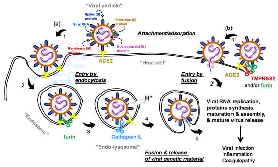 A representation of the viral particle of SARS-CoV-2 depicting the structural proteins: spike (S) protein, envelope (E) protein, membrane (M) protein, and nucleocapsid (N) protein. It also shows the early stage of the life cycle of the virus which starts by the spike S protein binding to the host cell ACE2, which is followed by viral entry. The viral entry takes place either by (a) endocytosis or (b) direct fusion. In endocytosis-mediated entry, the spike S protein activation appears to take place in endosomes by the action of furin. Further proteolysis and subsequent fusion occur because of the action of cathepsin L in endo-lysosomes. In direct fusion entry, the process is mediated by TMPRSS2 and/or furin; however, other trypsin-like proteases may also contribute. Either way, the RNA genetic material of the virus is released, and the late stage of the life cycle subsequently takes place by RNA replication, viral protein synthesis, maturation, assembly, and release of the new virus.