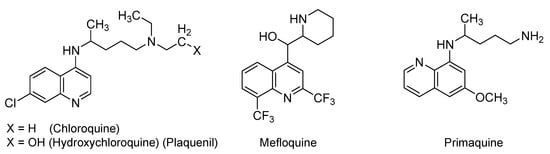 A series of quinoline derivatives is being investigated in various settings for the prevention and/or treatment of COVID-19. Specific derivatives are depicted in Figure 2 and include chloroquine, hydroxychloroquine, mefloquine, and primaquine. In particular, chloroquine is a 4-aminoquinoline derivative that has been approved for oral use in the prevention and treatment of malaria and extraintestinal amebiasis. It has also been indicated for the treatment of lupus erythematosus. Hydroxychloroquine (Plaquenil, first approved by the U.S. FDA in 1955) is a more hydrophilic derivative of chloroquine which has also been orally used for malaria, lupus erythematosus, and rheumatoid arthritis [,]. Less common antimalarial drugs are mefloquine, which is 4-methanolquinoline derivative, and primaquine, which is 8-aminoquinoline derivative []. Chloroquine inhibits the heme (toxic product, ferriprotoporphyrin IX) conversion to hemazoin (nontoxic byproduct) in malarial trophozoites. Accumulation of the toxic heme kills the parasite. Furthermore, chloroquine can also diffuse into the parasite acidic vesicles and increases internal pH, leading to the inhibition of the parasite growth [,]. The antimalarial mechanisms of hydroxychloroquine and mefloquine are similar to that of chloroquine []. However, primaquine works differently by producing reactive oxygen species or by inhibiting the electron transport process in the parasite. Primaquine may also directly disrupt the protozoal DNA [].