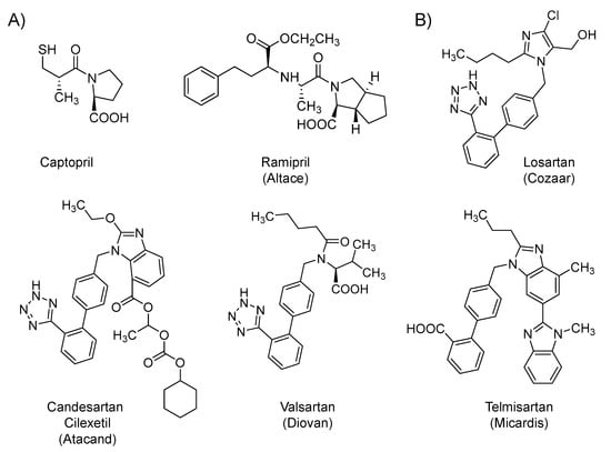 Several RAAS modifiers are being considered in the context of COVID-19 patients. Captopril (1981) and ramipril (Altace; 1991) (Figure 3A) are synthetic small molecule inhibitors of angiotensin-converting enzyme, a Zn-containing proteolytic enzyme that is responsible for the biosynthesis of angiotensin II. Moreover, losartan (Cozaar; 1995), candesartan cilexetil (Atacand; 1998), valsartan (Diovan; 1996), and telmisartan (Micardis; 1998) (Figure 3B) are synthetic small molecule antagonists that competitively block angiotensin II receptors. The two classes directly and/or indirectly decrease the biological activity of angiotensin II, which is an octapeptide that, upon binding to its receptors, promotes vasoconstriction and increases the release of catecholamines and aldosterone hormone, leading to/or contributing to a series of cardiovascular diseases, including hypertension and heart failure. In other words, the drugs in the two classes limit the detrimental effects of angiotensin II on the cardiovascular system, and thus, they are commonly orally used in the management of hypertension and heart failure []. Currently, several clinical trials are underway to evaluate the effects of ACEIs (captopril and ramipril) and the ARBs (losartan, candesartan, valsartan, and telmisartan) in patients infected with COVID-19. Thus far, the use of drugs from the two classes appears to be controversial. Some scientists have suggested a hypothetical benefit, while others have cautioned due to the possibility of a harmful effect.