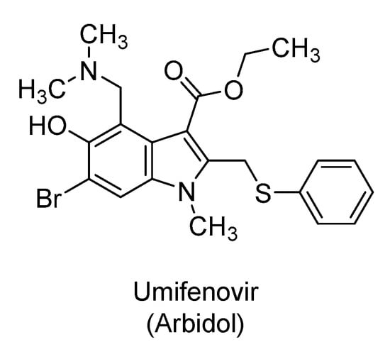 Umifenovir (Arbidol) is indole-3-ethylcarboxylate derivative (Figure 6) that is used in Russia, China, and other countries as a prophylactic or treatment for influenza and other respiratory infections [,]. It is a non-nucleoside antiviral agent with broad antiviral activity against non-enveloped and enveloped DNA and RNA viruses, including Ebola virus [], Zika virus [], hepatitis B and C viruses [], and herpes simplex viruses [], among others []. It is currently being evaluated in about five clinical trials for the treatment and/or prevention of SARS-CoV-2 infection. The drug is used pharmaceutically in the form of a hydrochloride salt.