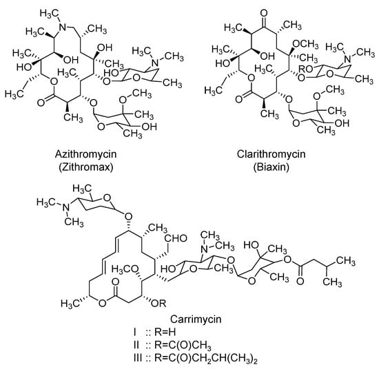 Another macrolide under investigation is carrimycin. Structurally, it appears to be a mixture of derivatives of spiramycin, a macrolide antibiotic similar to azithromycin. A survey of peer-reviewed literature and patent literature suggests that the 4”-OH group in spiramycin is modified to yield isovaleryl spiramycin I, II, and III (Figure 7) which together account for 60% of the whole mixture. Mechanistically, it inhibits the microbial protein synthesis by targeting the ribosomal RNA components [,]. Carrimycin (also known as biotechspiramycin or shengjimycin) has been developed by a synthetic biology technology and has shown potent antibacterial activity and significant inhibitory activity against mycoplasma and chlamydia. It also appears to be effective against drug-resistant Gram-positive bacteria, some Gram-negative bacteria, Candida albicans, and Mycobacterium tuberculosis, among others. It potentially has immunomodulatory action and antiproliferative activity [,]. Carrimycin was approved by the Chinese National Medical Products Administration in 2019 to treat upper respiratory infection. It is being tested in a multicenter, randomized, open-controlled study in China to determine its efficacy and safety in patients with COVID-19 (NCT04286503). The justifications for its use are similar to those described for azithromycin.