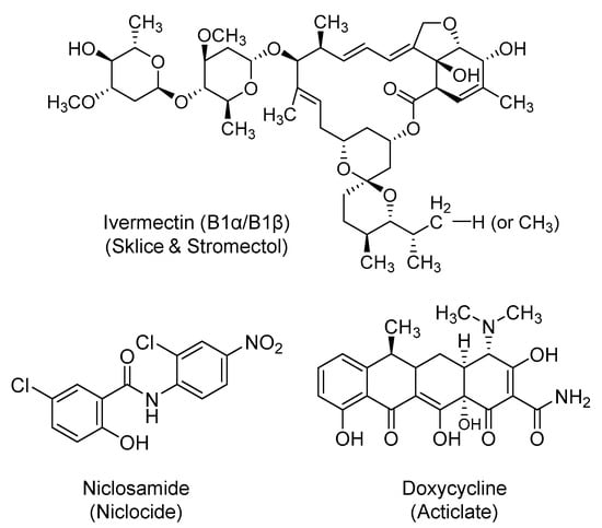The chemical structures of a broad-spectrum antiparasitic agent (ivermectin), an aryl nitro-based antiparasitic agent (niclosamide), and a broad-spectrum antibacterial agent (doxycycline). Doxycycline also exhibits potential anti-inflammatory effects.
