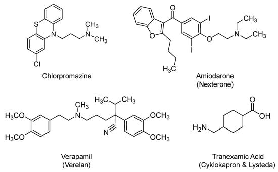 On one hand, amiodarone (Nexterone) is a benzofuran derivative (Figure 9) that is classified as a class III antiarrhythmic agent. Amiodarone was first approved by the U.S. FDA in 1985. It is orally or parenterally used to manage life-threatening recurrent ventricular fibrillation or recurrent ventricular tachycardia refractory to other antiarrhythmic agents or in patients intolerant of other agents used for these conditions []. It inhibits adrenergic stimulation and affects endogenous mono and di-cation channels. On the other hand, verapamil (Verelan) is a phenylalkylamine calcium channel blocker (Figure 9) that was first approved in the U.S. in 1981. It is orally or parenterally used in the treatment of hypertension, cardiac arrhythmia, and angina []. It is also classified as a class IV antiarrhythmic agent. The two drugs are being evaluated in COVID-19-hospitalized patients with symptoms (NCT04351763). Several studies have shown that amiodarone and verapamil can interfere with the viral entry and amplification by blocking calcium ion channels []. Amiodarone and verapamil may also accumulate into late endosomes/lysosomes, and given their chemical basicity, they may increase the pHs of these organelles. As a result, the two drugs may block the fusion of viral and endosomal membranes, prevent the release of the viral genetic material into the cytoplasm, and ultimately inhibit the virus replication [,,,,].