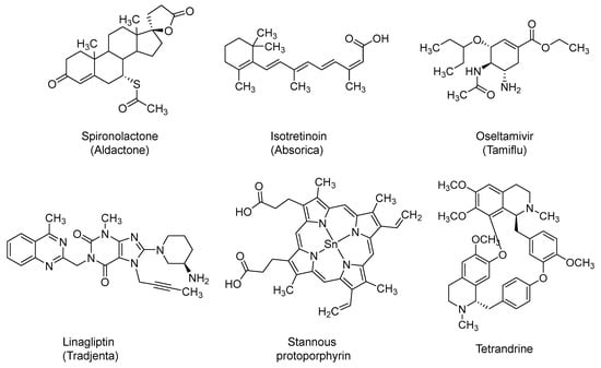 Isotretinoin (Absorica) (Figure 10) is a retinoid derivative of vitamin A. Isotretinoin, also known as 13-cis retinoic acid, was first approved by the U.S. FDA in 1982. It is used orally to treat severe recalcitrant nodular acne. The mechanism is not well understood, yet it may involve apoptosis induction in various cells, including sebaceous gland cells. Isotretinoin has a low affinity for retinoid receptors; however, its intracellular metabolites may act as better agonists for these receptors [,]. Few clinical trials appear to include the use of isotretinoin in COVID-19 patients. Isotretinoin has been identified as a strong down-regulator of ACE2; thus, it has been proposed to interfere with the viral entry []. Isotretinoin was also recently identified as a potential PLpro inhibitor in a computational exercise []. Importantly, isotretinoin has been reported to significantly inhibit monocyte and neutrophil chemotaxis in acne patients indicating potential anti-inflammatory effects [].