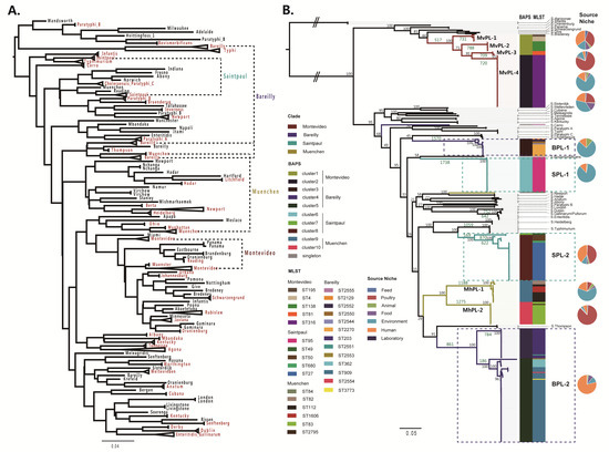 Phylogenetic analysis of the Salmonella strains. (A) Maximum-likelihood (ML) tree based on the 7 multi-locus sequence typing (MLST) genes among 4498 strains. Clade labels shown in red color clustered with more than 3 strains. The clusters of putative polyphyletic serovars marked with dotted lines. (B) Core genome phylogenetic analysis of 347 strains. Serovars Montevideo, Bareilly, Saintpaul, and Muenchen were designated as MvPL, BPL, SPL, and MhPL, respectively. The black values of the primary nodes of the tree are the bootstrap values (100 replicates). The single nucleotide polymorphisms (SNPs) on important branches are also shown in green. The colored blocks next to the tree indicate the Bayesian Analysis of genetic Population Structure (BAPS) clusters and sequence types (STs) that an isolate belongs to. The pie chart represents source niche of strains carrying each lineage-specific ST.