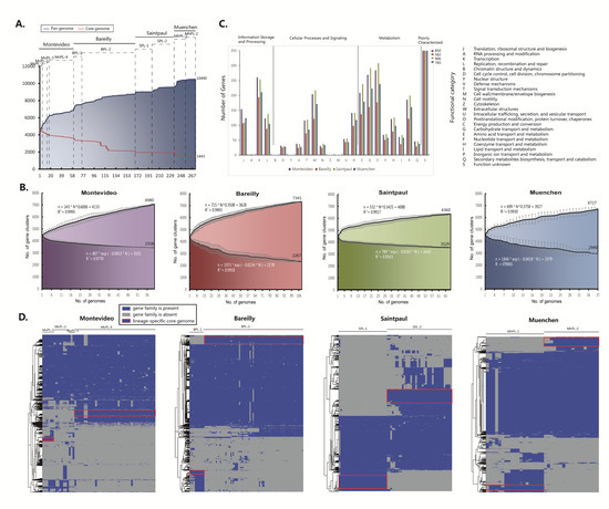 Core and pan genome analysis. (A) Core and pan genome curves for strains in lineages of Montevideo, Bareilly, Saintpaul, and Muenchen. (B) Increase and decrease in gene families in the pan genome and core genome. Black spots are the averages of each value. Error bars indicate standard deviation in the number of core and pan gene clusters among different strains. The deduced mathematical functions of core and pan genome curves are also reported. (C) Distribution of clusters of orthologous group (COG) catalogues of core gene families. (D) Cluster map of the accessory genome. The gene families that are unique to a lineage and conserved across most strains in that lineage are framed in red.