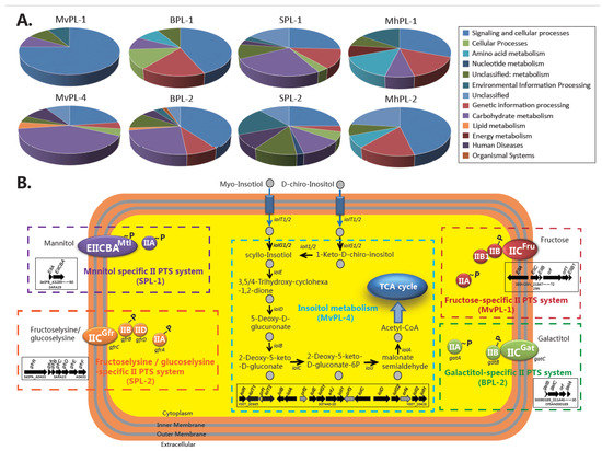 Niche preferences may be associated with lineage-specific genomic content. The cluster heatmaps (Figure 2D) of the accessory genomes of four selected serovars reveal that each distinct lineage is differentiated by a set of lineage-specific conserved gene families (framed in red, Figure 2D). MvPL-1 to 4, BPL-1 and 2, SPL-1 and 2, and MhPL-1 and 2 had 43, 1, 4, 66, 55, 162, 177, 135, 77, and 133 lineage-specific gene families (see Table S4), respectively, which were assigned according to the KEGG database. The KEGG functional classification is shown in Figure 3A, in which “metabolism”, “cellular processes”, and “genetic information processing” are the major functional categories. The functional categories involved in metabolism were enriched in the lineage-specific genomic contents, which indicated the differences in metabolic abilities and niche adaptation between distinct lineages.