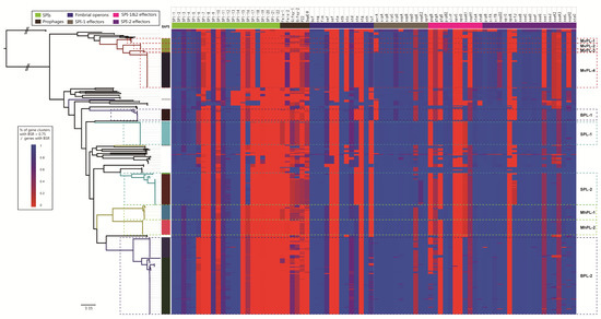 Heatmap of the distribution of SPIs, prophage, fimbrial operons, and effectors. Color coding for the gene clusters (SPIs, prophage, and fimbrial operons) is based on the percentage of genes on a cluster that are present in a genome (defined as the Blast score ratio (BSR) of query gene > 0.75). Color coding for effectors is based on the Blast score ratios calculated when the genomic data were screened against the effectors.