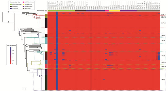 To examine SPI-1 to -22, prophage, fimbrial operon, and effectors, gene or gene cluster were located and screened using the LS-BSR tool with default parameters [57]. The reference database included acquired resistance genes and mutations conferring resistance to seven antimicrobial classes (aminoglycosides, phenicols, quinolones, sulphonamides, tetracyclines, trimethoprim, and β-lactams) [11,58]. The nucleotide sequences of reference resistance genes (see Table S5) were downloaded from the Resfinder 2.0 database [59] and the ARDB 1.1 Database [60]. To identify the resistance genes, the genomes were aligned using BLASTn with an E-value cutoff < 10−6, identity > 60%, and coverage > 60% against the dataset of reference resistance genes.