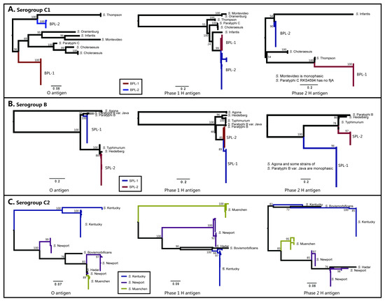 To construct the phylogeny, the core genes across the O, H1, and H2-antigen gene clusters were extracted, respectively. The core gene name across the O, H1, and H2 antigen gene clusters of serogroup C1, B, and C2 was listed in Table S6. The genes coding for O antigen synthesis are normally present as a gene cluster in the genome, which maps between galF and gnd in Salmonella [61]. The details of the genetic structure of Salmonella O-antigens were reviewed previously [61]. The extracted sequences were aligned with MAFFT [51], and were generated trees using MEGA 7 [52], (with the GTR model).