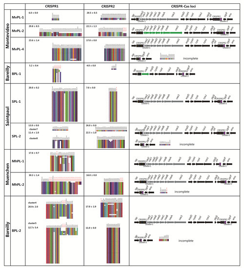 CRISPR-Cas system might provide effective information that is useful for typing [46,47,48]. To evaluate the microevolution of the CRISPR-Cas system at the intra-serovar level, sequence analysis of the CRISPR-Cas systems across these four serovars were performed. By comparison of these spacers and the known spacers implemented in Institut Pasteur [48], 304 different spacers were found, including 260 known spacers and 44 new spacers (Figure 7). There are 192 and 122 different spacers in CRISPR1 and CRISPR2, respectively, among these four serovars. All the CRISPR1 and CRISPR2 spacer arrays identified are shown in Figure 7. Strains within an individual lineage have very similar spacer content and identical orders within the arrays for both CRISPR1 and CRISPR2. Each phylogenetic lineage exhibits a distinct spacer content and organization of both CRISPR1 and CRISPR2. Only a few shared spacers were found among distinct lineages in an individual serovar. In CRISPR1, MvPL-1, BPL-2, SPL-1, and MhPL-2 possess a greater number of spacers than other lineages of each serovar. In CRISPR2, SPL-2 possess more spacers than SPL-1. Specifically, MhPL-1 and most strains of BPL-1 do not contain CRISPR2. Furthermore, there are two distinct sets of CRISPR arrays in both SPL-2 and BPL-2 (Figure 7), which are subdivided into two clusters by BAPS in the core genome tree.