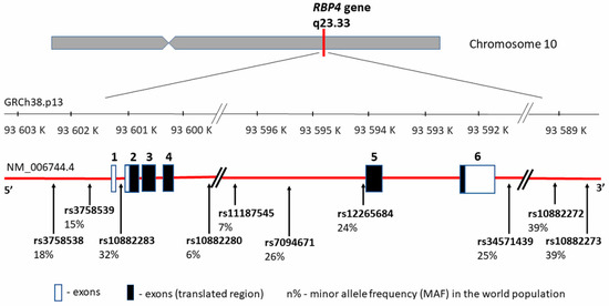 Since RBP4 may be correlated with conditions related to Type 2 diabetes mellitus (T2DM), obesity, or CVD, the RBP4 gene may constitute the gene carrying obesity-related implications [54]. Additionally, the RBP4 gene location is close to a region linked with an increased risk of T2DM and elevated fasting blood glucose levels [55,56,57]. Thus, it has been proposed that functional RBP4 gene polymorphisms influence a higher obesity incidence, insulin resistance, hyperinsulinemia, T2DM, and artery thickness [26]. These hypotheses were confirmed by research carried out in recent years by several research teams. The most significant RBP4 gene variants connected with CVD and its markers are summarized in Table 2 and presented in Figure 2, with the distribution of each locus and the minor allele frequency (MAF) occurrence in the world population based on 1000 Genomes Project data (phase 3; https://www.internationalgenome.org/). It is worth noting that all of the listed variants are located outside the coding gene region and that there can be a potential relationship between the regulation and the change in gene expression levels.