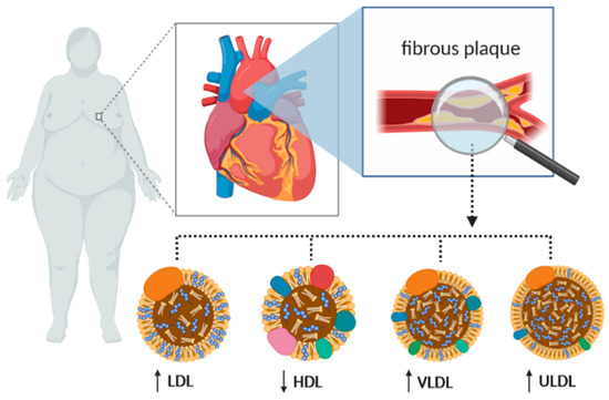 Lipid disorders impacted by RBP4 as the main levels of risk of cardiovascular disease caused by obesity. LDL—low-density lipoprotein; HDL—high-density lipoprotein; VLDL—very-low-density lipoprotein; ULDL—ultra low-density lipoprotein.