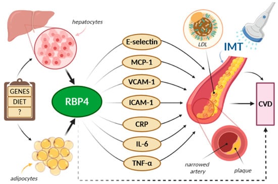 Cardiovascular disease (CVD) constitutes the most common cause of death in European countries, accounting for 2.2 million deaths in females (47% of all-cause of deaths) and 1.9 million deaths in males (39% of all-cause of deaths) [1,2,3,4]. Additionally, it is responsible for 37% and 34% of all years lost (measured by potential years of life lost, PYLL) among females and males, respectively [1]. Not only is CVD a health issue, but it also involves a significant socio-economic impact [1]. It is estimated that by 2030 the total cost of CVD will rise to USD 1044 billion [5]. Currently, more than half (55%) of the costs is derived from direct healthcare (report on Accident and Emergency departments, medications; inpatient-, outpatient-and primary care) and 45% of the costs originate from the informal care and productivity loss due to morbidity and mortality [4]. The major risk factors of CVD development have been identified in the Framingham Heart Study and INTERHEART case-control study [6,7]. Eight risk factors and health behaviors (hypertension, dyslipidemia, diabetes, obesity, smoking, alcohol, diet, sedentary lifestyle) are the World Health Organization’s (WHO) targets for reduction by 2025 [8]. Obesity is a serious health problem and, if the current trends continue, in the next ten years, almost 40% and 20% of the global adult population will be suffering from overweight and obesity, respectively [9]. Currently, it is estimated that over 3 million patients worldwide die due to excessive body weight [10]. Moreover, obesity may influence cardiovascular risk by means of the presence of obesity-related comorbidities, hemodynamic repercussions, body fat mass content and distribution [11,12,13]. All-cause mortality increased log-linearly throughout the overweight range, with the hazard ratio (HR) of 1.39 per 5 kg/m2 [14]. Excessive accumulation of adipose tissue, particularly visceral fat (VF), contributes to a higher prevalence of hypertension, dyslipidemia, and glucose intolerance, which lead to CVD development [15,16,17]. Adipose tissue also regulates many systemic and pathological processes due to the secretion of bioactive proteins—adipokines [18]. Most of them—e.g., tumor necrosis factor-α (TNF-α); IL-6: interleukin (IL-6)—have pro-inflammatory properties and have been associated with vascular and atherothrombotic complications in atherosclerosis, since they influence the function of endothelial cells, arterial smooth muscle cells, and macrophages in the vessel walls [19,20,21,22,23]. However, few of them may have a protective effect in CVD (e.g., adiponectin). In fact, among patients with obesity, the secretion of adipokines is frequently abnormal [24]. In this non-systematic review, we have characterized one of the novel adipokines—retinol-binding protein 4 (RBP4), with a particular emphasis on its role in obesity and CVD development. However, there is an ongoing controversy with regard to any RBP4 role in both inflammation and CVD prediction. Thus, more reviews and research studies are still necessary.