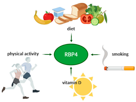Compliance with the DASH diet was independently associated with lower RBP4 serum levels among middle-aged and elderly adults [104]. Furthermore, higher compliance with the MeD resulted in lower RBP4 levels, regardless of weight loss or caloric restriction [105]. On the other hand, a high-quality, plant-based diet was associated with lower plasma levels of several adipokines, but not with RBP4 levels and inflammatory markers [106]. Similar results were shown in other studies [107,108]. It has been suggested that protein intake is more crucial than the caloric intake for RBP4 levels [109]. In fact, an energy-restricted diet with a higher protein intake was associated with a 30% greater decrease in RBP4 levels (35% compared with 20% of protein intake) [110]. In another study, serum RBP4 levels decreased more in the course of a hypocaloric carbohydrate-restricted diet than during a hypocaloric low-fat diet [111]. However, in both diets, changes in RBP4 were associated with changes in LDL particle size—essential in the atherosclerotic process and associated with IMT. According to Daneshzad et al., RBP4 levels were positively associated with vitamin A intake among patients with obesity [112]. This result could be explained by the fact that a higher vitamin A intake would require higher RBP4 levels for transportation, storage, and metabolization. As the Zhou et al. study showed, RBP4 was a predictor for developing diabetic atherosclerosis in an animal model, and its levels decreased following a vitamin D supplementation [113]. Omega-3 supplementation decreased RBP4 levels among adolescents with obesity; however, the effect was not statistically significant when compared to lifestyle intervention alone [114]. It has been shown that the intake of selenium, an antioxidant mineral, is inversely associated with RBP4 levels [115]. Nevertheless, data concerning weight-loss and its influence on the changes in RBP4 levels are contradictory, and this aspect should be investigated further [70,105,109]. However, it is essential to keep in mind that weight loss does not have to affect the hepatic production of RBP4, although it may impact adipose tissue RBP4-production. Interestingly, RBP4 possibly correlates with an increased regain of lost weight and is one of the predictors of metabolic syndrome among people with excessive body weight [70,75]. Lifestyle features, such as smoking or physical activity, were associated positively and negatively with plasma RBP4 levels, respectively [115,116]. The lifestyle factors affecting RBP4 levels are schematically presented in Figure 5.