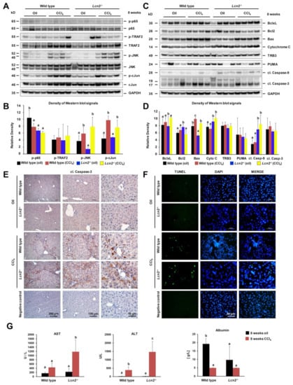 Chronic CCl4-induced hepatocyte apoptosis via JNK/c-Jun and mitochondrial pathways. (A) Western blot analysis and (B) quantification of p65 NF-κB, TRAF2, p-JNK, JNK, p-c-Jun, and c-Jun signaling cascades with GAPDH as a loading control, showing significant JNK/c-Jun activation in CCl4-treated mice. (C) Western blot analysis and (D) quantification showing Bcl2 family proteins Bcl-xL, Bcl2, Bax, and PUMA. Bax levels were higher in both types of CCl4-treated mice, with lower levels of Bcl2 in CCl4-treated Lcn2−/− livers, with fluctuating levels of PUMA. Cleaved Caspase-9 levels were higher in oil- and CCl4-treated Lcn2−/− mice, but TRB3 and cleaved Caspase-3 levels were increased in CCl4 administered livers, with GAPDH loading controls. (E) Immunohistochemistry staining of cleaved caspase-3 depicted positive signals distributed homogenously in non-parenchymal liver cells after mineral oil administration. In contrast, CCl4-treated wild type livers showed caspase-3 staining in infiltrating inflammatory macrophages around hepatic central veins, while in Lcn2−/− mice cleaved caspase-3 was detected in both inflammatory cells and surrounding hepatocytes. (F) Terminal deoxynucleotidyl transferase dUTP nick end labeling (TUNEL)-stained paraffin slides showing TUNEL-positive infiltrating inflammatory cells around hepatic central veins of CCl4-treated wild type livers. Lcn2−/− livers showing TUNEL-positive cells scattered in hepatocytes zone 3 with minimal TUNEL-positive cells after mineral oil administration. (G) Serum aspartate transaminase (AST) and alanine transaminase (ALT) levels were significantly higher in CCl4-treated Lcn2−/− mice, while serum albumin levels showed decreases in CCl4-treated mice. Details about the statistics are given in Supplementary Tables S2–S4.