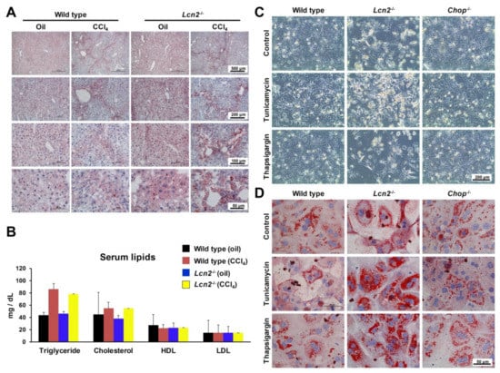 ER stress-induced steatosis. (A) Oil Red O-stained liver slides showing slightly increased amounts of lipid droplets in oil- and CCl4-injected Lcn2−/− mice compared to wild type animals. (B) Serum triglyceride levels in CCl4-treated Lcn2−/− mice had a tendency to be slightly lower than in wild type due to triglyceride accumulation and steatosis. No changes in serum high-density lipoprotein (HDL) and low-density lipoprotein (LDL) were observed. Details about the statistics are given in Supplementary Table S5. (C) Phase contrast microscopic pictures of cultured primary hepatocytes isolated from wild type, Lcn2−/−, and Chop−/− mice treated with tunicamycin (TM) and thapsigargin (TG) for 36 h. Lcn2−/− hepatocytes appeared to detach from the culture plates and be less confluent than wild type and Chop−/−. (D) Oil Red O-stained cultured primary hepatocytes treated with TM or TG for 36 h showing Lcn2−/− hepatocytes to already contain more lipid droplets than the wild type and Chop−/− hepatocytes, followed by 36 h TM or TG treatments showing significant enhanced lipid droplet formation.