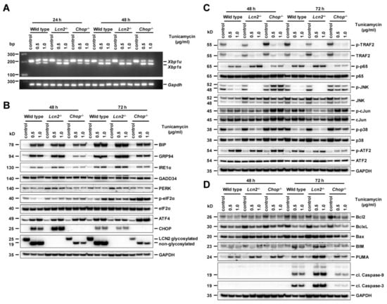 Tunicamycin incubation for 48 and 72 h did induce hepatocyte apoptosis. (A) Semi-quantitative PCR showing unspliced (Xbp1u) and spliced Xbp1 (Xbp1s) mRNA after 24 and 48 h tunicamycin (TM) incubation. The levels of Xbp1s mRNA became almost level in all types of hepatocytes at 48 h. (B) Western blots of UPR signaling proteins BiP, GRP94, IRE1α, ATF6, PERK, p-eIF2α, eIF2α, ATF4, and CHOP. High amounts of CHOP in Lcn2−/− declined comparable to wild type levels at 72 h. Accumulation of glycosylated and non-glycosylated LCN2 proteins in wild type showed significant uptick compared to Chop−/− hepatocytes in 48 and 72 h TM incubation, with GAPDH as loading control. (C) Depicting TM induction of p65 NF-κB, TRAF2, JNK, and p38 MAPK activations. Phosphorylation of JNK/c-Jun and p38 was markedly increased in Chop−/− hepatocytes, while the signals in wild type and Lcn2−/− already declined. The ATF2 phosphorylation remained persistent in all types of hepatocytes, but were slightly lower in Chop−/− at 72 h. (D) Bcl2 family protein expression showed decreased Bcl2 and Bcl-xL levels in all types of hepatocytes, while Bax was upregulated in Lcn2−/−. BH3-only proteins BIM and PUMA increased with highest levels in Lcn2−/− hepatocytes well in correspondence to the levels of cleaved Caspase-9 and 3, but minimal in Chop−/− hepatocytes. GAPDH served as loading control.
