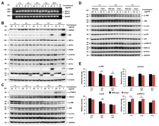 To verify Chop−/− hepatocytes delayed JNK activation, we next looked at the early period of TM stimulation and found Xbp1s mRNA production to start 2 h upon TM incubation (Figure 6A). Phosphorylated eIF2α levels were detected already at 1 h and increased persistently, followed by ATF4 and CHOP at 4 and 8 h, respectively. Upregulation of BiP and GRP94 was noticed at 8 and 24 h, while the block of LCN2 glycosylation started at 1 h and progressed over time (Figure 6B). The amount of p-JNK registered highest at 1 h, with continuous decline thereafter, while downstream p-c-Jun increased at 2 h, followed by a slow decline in correspondence to the levels of p-JNK (Figure 6C).