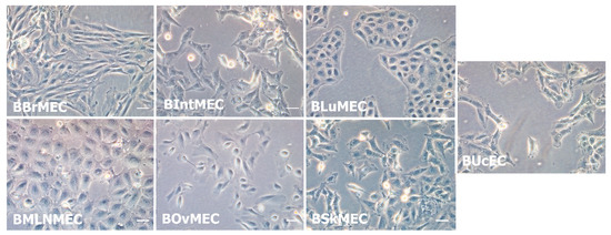 All cell lines displayed endothelial cell characteristic morphologies. Nevertheless, slight morphological differences were observed between the seven cell lines during their growth (Figure 1). Under microscope, bovine mesenteric lymph node microvascular endothelial cells (BMLNMEC) were bigger than the cells from other lines. Bovine brain microvascular endothelial cells (BBrMEC) were very slender, whereas bovine lung microvascular endothelial cells (BLuMEC) and BMLNMEC were stocky cells, and very adhesive between them. All these cell lines, except bovine ovary microvascular endothelial cell (BOvMEC) line, were patented (CNRS/EnvA Patent FR 19 15307) and deposited at the Collection Nationale de Cultures de Microorganismes (Institut Pasteur, Paris, France).