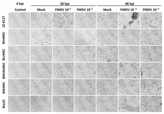Viral infections of bovine endothelial cell lines by foot-and-mouth disease virus (FMDV). BIntMEC, BLuMEC, BMLNMEC, BSkMEC, and BUcEC were inoculated with FMDV strain of O serotype (2 viral doses: MOI 10−3 and 10−5) and monitored for cytopathic effect (CPE) during 48 h using an inverted LEICA Statif DM IL LED microscope (×10 magnification). ZZ-R127, fetal goat tongue epithelial cells, were used as positive controls. The pictures presented correspond to 20 and 48 h post-infection (hpi). Scale bars represent 100 μm.