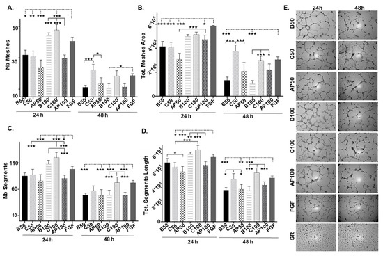 Effect of CAC secretome on endothelial colony-forming cells (ECFC) angiogenic potential. ECFC were treated (n:3 per condition) with either serum free-EBM-2 medium, basal condition (B50, B100); CAC control secretome (C50, C100) or the secretome of CAC pre-incubated with AP factors (AP50, AP100), at different concentrations (50 and 100 ng/μL), for 24 and 48 h. In addition, ECFC were incubated with FGF (angiogenesis activator) and SR (inhibitor) as positive and negative angiogenic controls. Graphical results indicate (A) number of meshes, (B) total meshes area (pixels2), (C) number of segments, and (D) total segments length (pixels). (E) Representative image of all conditions tested at 24 and 48 h are shown. Images were taken with an inverted phase-contrast microscope, under 40× magnification. Data were presented as mean ±SE. The most relevant significant changes are shown (* p < 0.05; ** p < 0.01; *** p < 0.001), while the entire set of p-values < 0.05 has been included in Supplementary Table S3. Significant differences between conditions (—); Significant differences vs. the activator (FGF) (----).