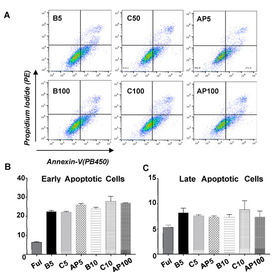 Effect of CAC secretome on ECFC apoptosis. ECFC were treated (n:3 per condition) with EBM-2 full (5% FBS + Growth factors, Full); serum free EBM-2 medium as basal condition (B), 50 or 100 ng/μL secretome of un-stimulated, control CAC (C50 and C100 respectively) and 50 or 100 ng/μL secretome of CAC pre-incubated whit AP factors (AP50 and AP100) for 24 h. Flow cytometry analysis was done using Annexin-V and Propidium Iodide. Graphs indicate the percentage of (A) representative dot-plots with propidium iodide (PE) and annexin-V (PB450 labelling) is shown for all conditions tested. (B) Early or (C) late apoptotic cells seen, represented as mean ± SE.
